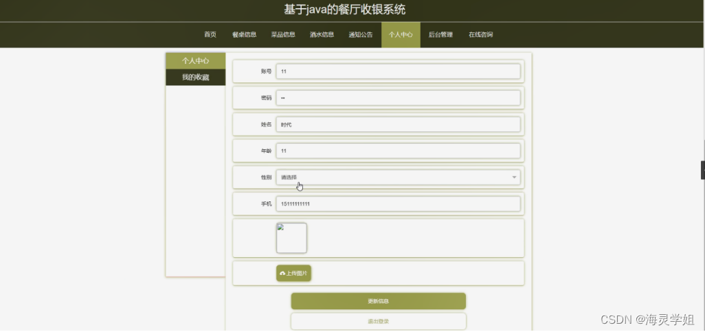 个人中心,在个人中心页面通过填写账号,密码,姓名,年龄,性别,手机,上传图片等内容进行更新信息操作,还可以对我的收藏进行详细操作;如图5-6所示。