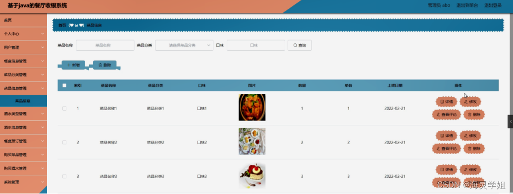 菜品信息管理,在菜品信息管理页面可以对索引,菜品名称,菜品分类,口味,图片,数量,单价,上架日期等内容进行详情,修改,查看评论和删除等操作,如图5-11所示。