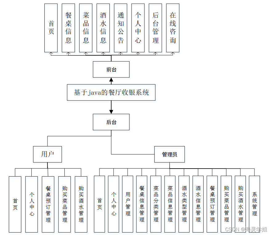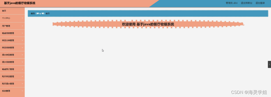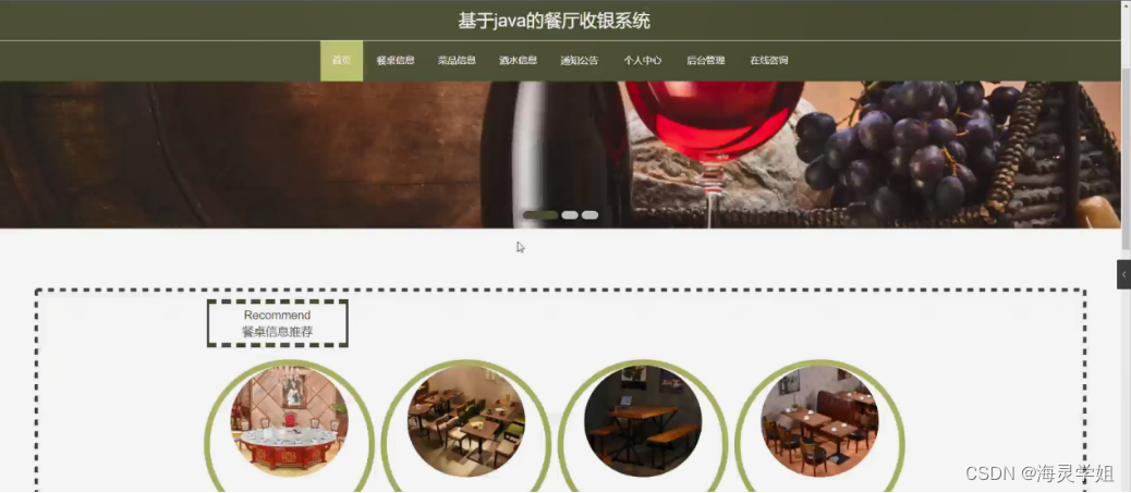 该款餐厅收银系统;用户可以通过注册账号从而登入系统主界面来实现相对应的功能,分别是查看首页,餐桌信息,菜品信息,酒水信息,通知公告,个人中心,后台管理,在线咨询等功能。