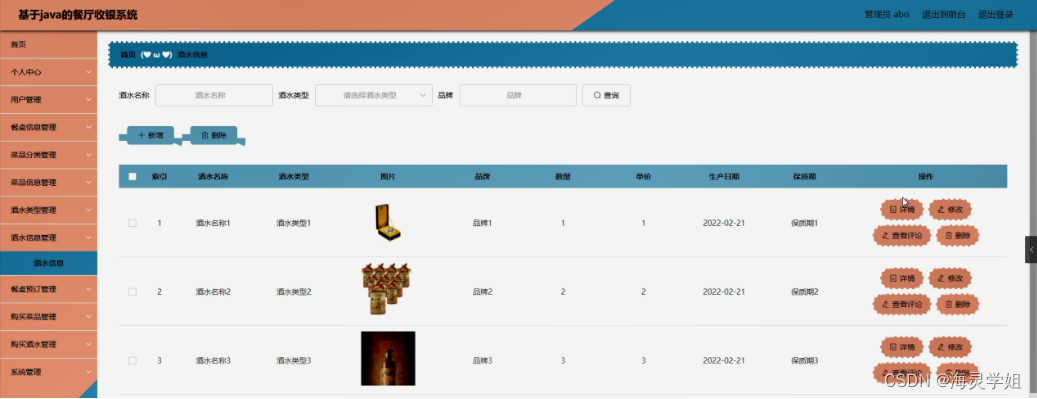 酒水信息管理,在酒水信息管理页面可以对索引,酒水名称,酒水类型,图片,品牌,数量,单价,生产日期,保质期等内容进行详情,修改,查看评论和删除操作,如图5-12所示。