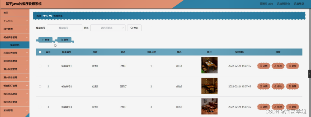 餐桌信息管理,在餐桌信息管理页面可以对索引,餐桌编号,位置,状态,可做人数,颜色,图片,实时时间等信息进行详情,修改和删除等操作,如图5-10所示。