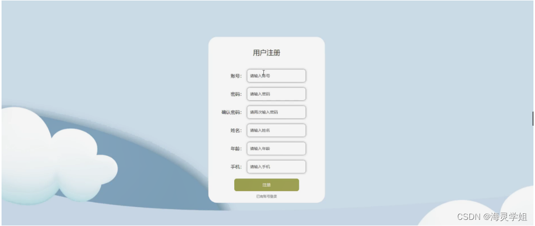 用户注册,在用户注册页面通过填写账号,密码,确认密码,姓名,年龄,手机等信息进行注册操作;如图5-2所示。