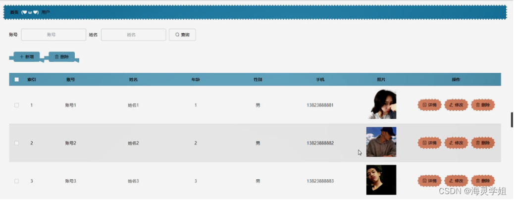 用户管理,在用户管理页面可以对索引,账号,姓名,年龄,性别,手机,照片等内容进行详情,修改和删除等操作,如图5-9所示。