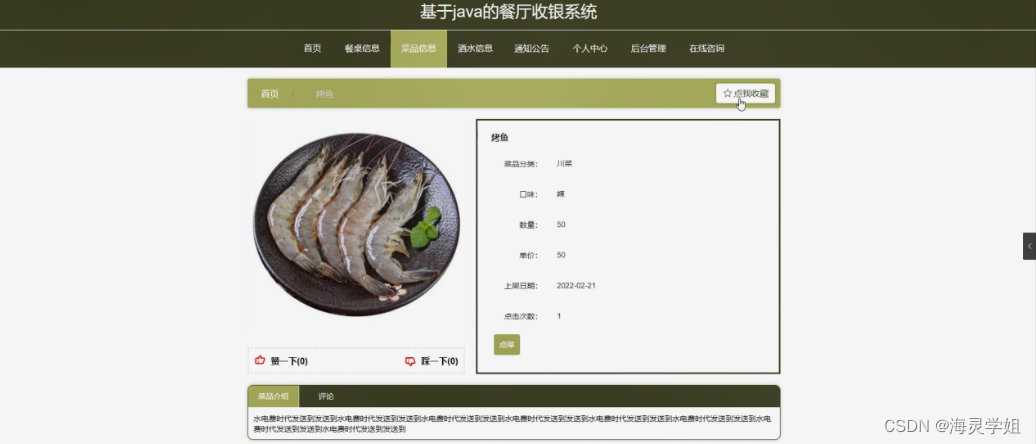 菜品信息,在菜品信息页面可以查看菜品名称,菜品分类,口味,图片,数量,单价,上架日期,菜品介绍等内容,并根据需要进行点菜,评论和收藏操作;如图5-4所示。