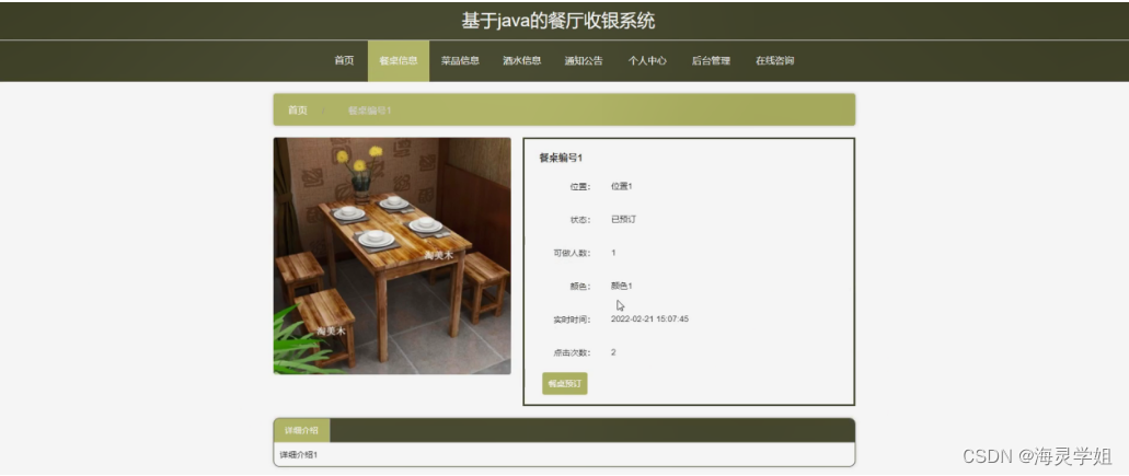 餐桌信息,在餐桌信息页面可以查看餐桌编号,位置,状态,可做人数,颜色,实时时间,详情介绍等内容;并进行餐桌预订操作;如图5-3所示。