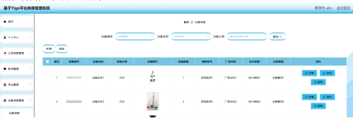 设备信息管理,在设备信息管理页面可以对索引,设备编号,设备名称,设备分类,设备图片,设备数量,规格型号,厂家名称,技术参数,注意事项等内容进行详情,修改和删除等操作,如图5-6所示。