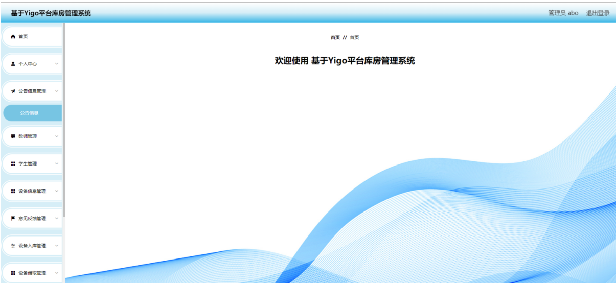 管理员登录系统后,可以对首页,个人中心,公告信息管理,教师管理,学生管理,设备信息管理,意见反馈管理,设备入库管理,设备借取管理,设备出库管理,消息提醒管理,设备续借管理,设备归还管理等功能进行相应的操作管理,如图5-2所示。