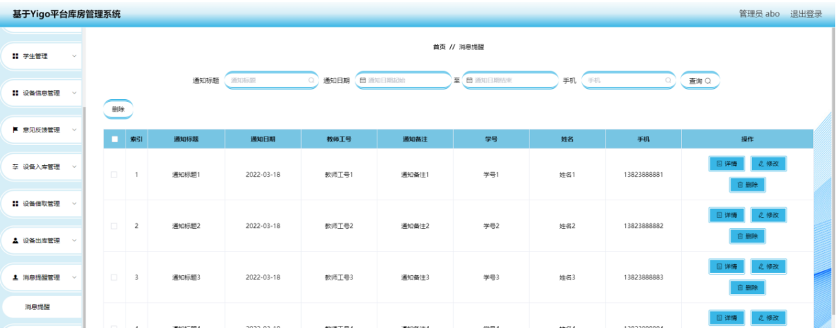 消息提醒管理,在消息提醒管理页面可以对索引,通知标题,通知日期,教师工号,通知备注,学号,姓名,手机,等内容进行详情,修改和删除操作,如图5-11所示。
