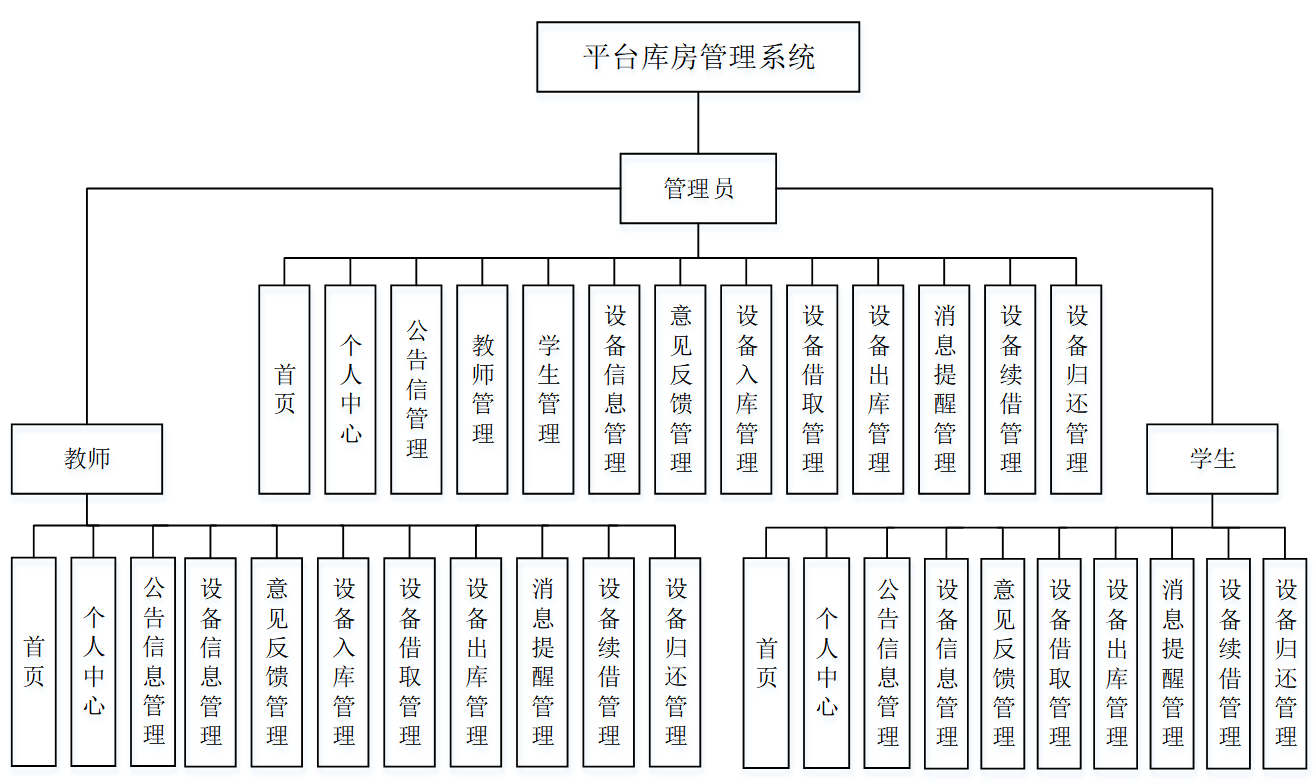 为了更好的去理清本系统整体思路,对该系统以结构图的形式表达出来,设计实现该平台库房管理系统的功能结构图如下所示: