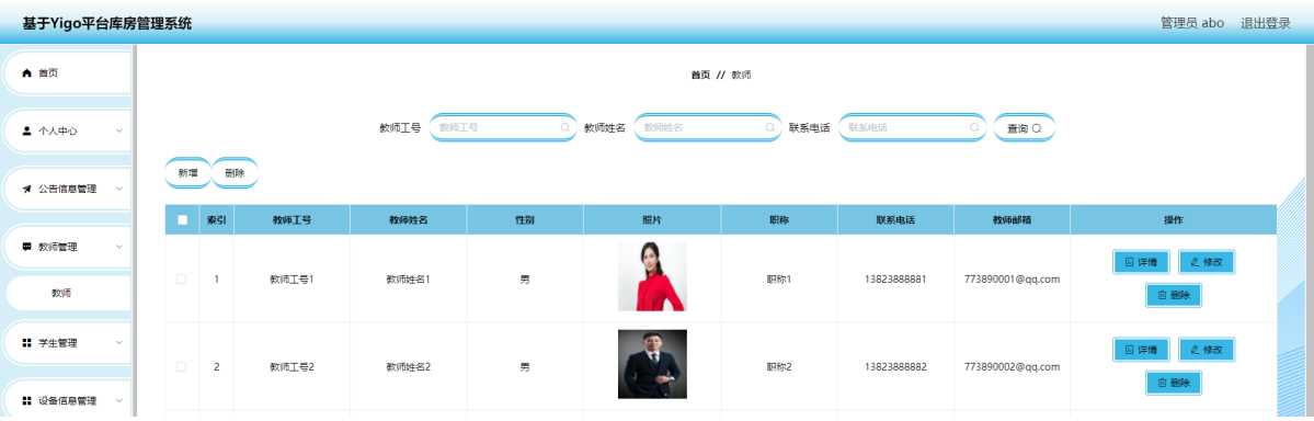 教师管理,在教师管理页面可以查看索引,教师工号,教师姓名,性别,照片,职称,联系电话,教师邮箱等内容进行详情,修改和删除操作,如图5-4所示。