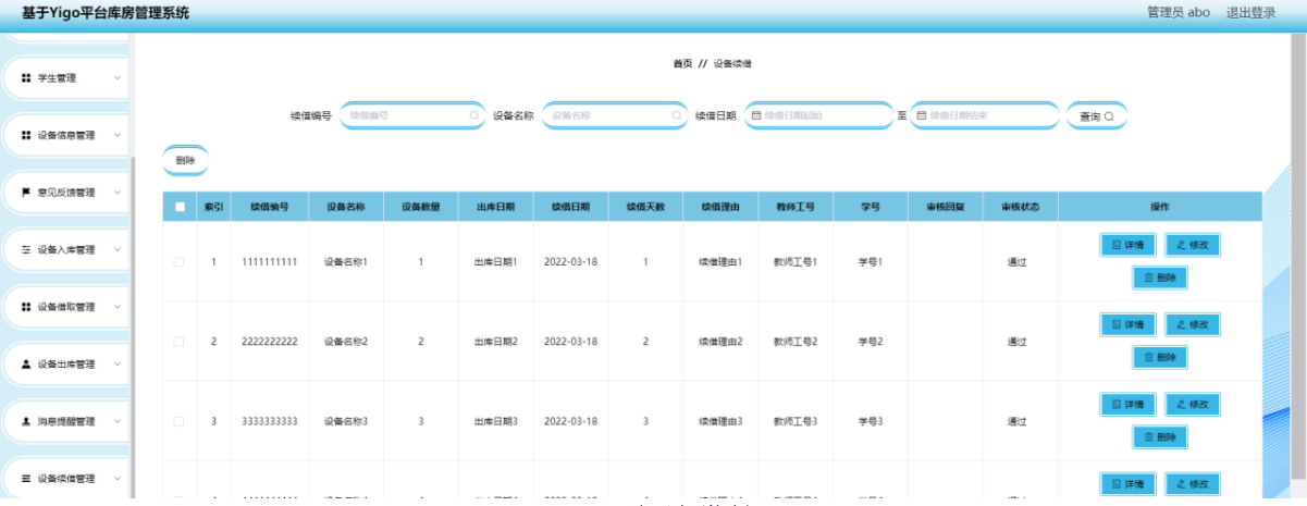 设备续借管理,在设备续借管理页面可以对索引,续借编号,设备名称,设备数量,出库日期,续借理由,教师工号,学号,审核回复,审核状态等内容进行详情,修改和删除操作,如图5-12所示。