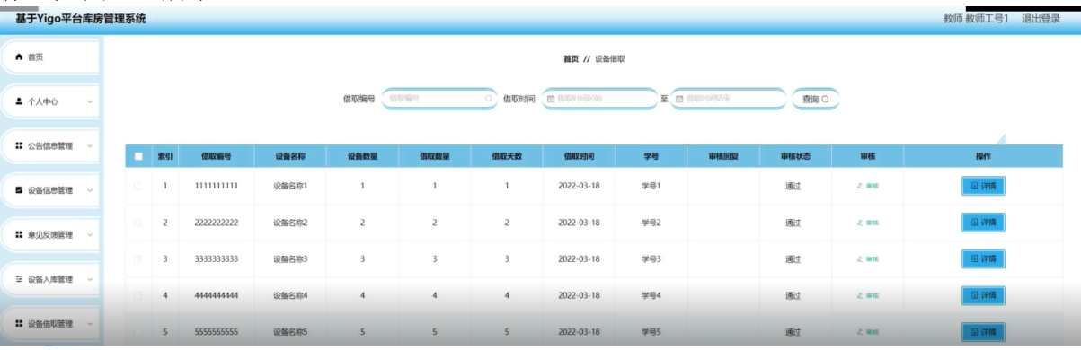 设备借取管理,在设备借取管理页面可以对索引,借取编号,设备名称,设备数量,借取数量,借取天数,借取时间,学号,审核回复,审核状态等内容进行详情,修改和删除操作,如图5-9所示。