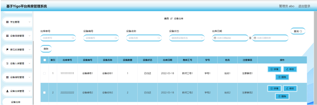 设备出库管理,在设备出库管理页面可以对索引,出库单号,设备编号,设备名称,设备数量,设备状态,出库日期,教师工号,学号,姓名,注意事项等内容进行详情,修改和删除操作,如图5-10所示。