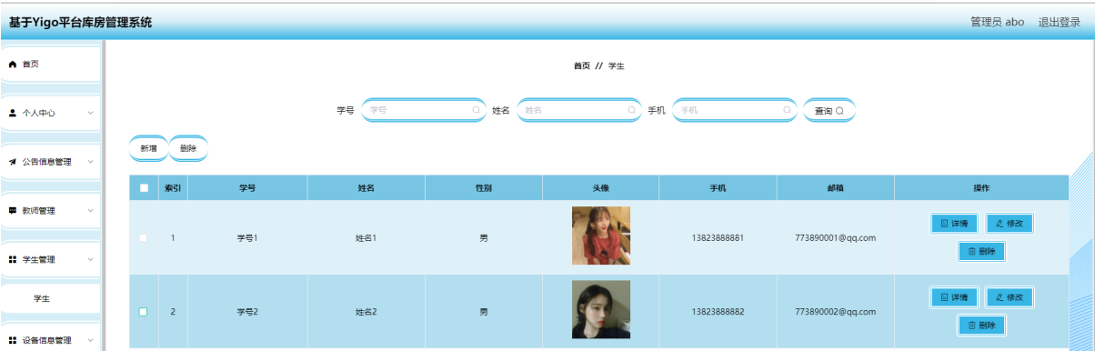 学生管理,在学生管理页面可以查看索引,学号,姓名,性别,头像,手机,邮箱等内容进行详情,修改和删除操作,如图5-5所示。