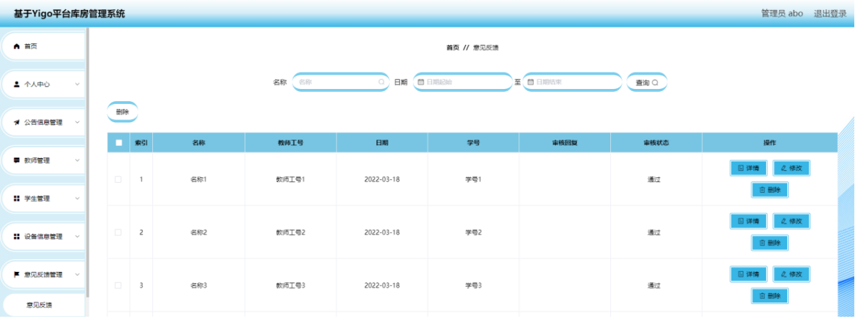意见反馈管理,在意见反馈管理页面可以对索引,名称,教师工号,日期,学号,审核回复,审核状态等内容进行详情,修改和删除等操作,如图5-7所示。