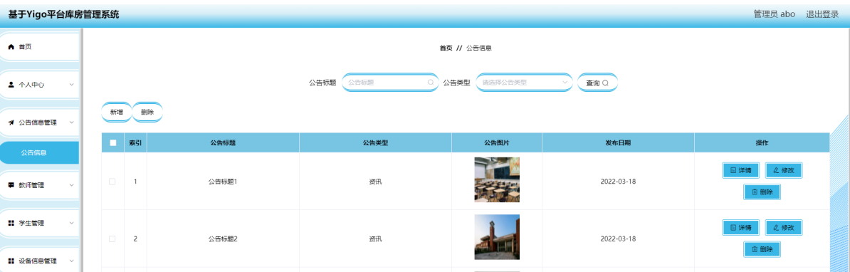 公告信息管理,在公告信息管理页面可以对索引,公告标题,公告类型,公告图片,发布日期等内容进行详情,修改和删除操作,如图5-3所示。