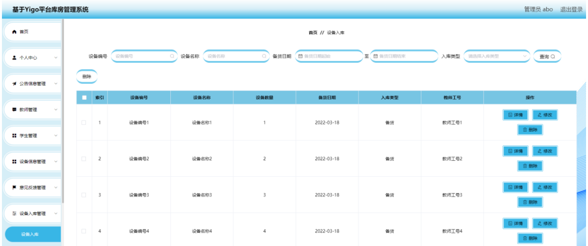 设备入库管理,在设备入库管理页面可以对索引,设备编号,设备名称,设备数量,备货日期,入库类型,教师工号等内容进行详情,修改和删除操作,如图5-8所示。