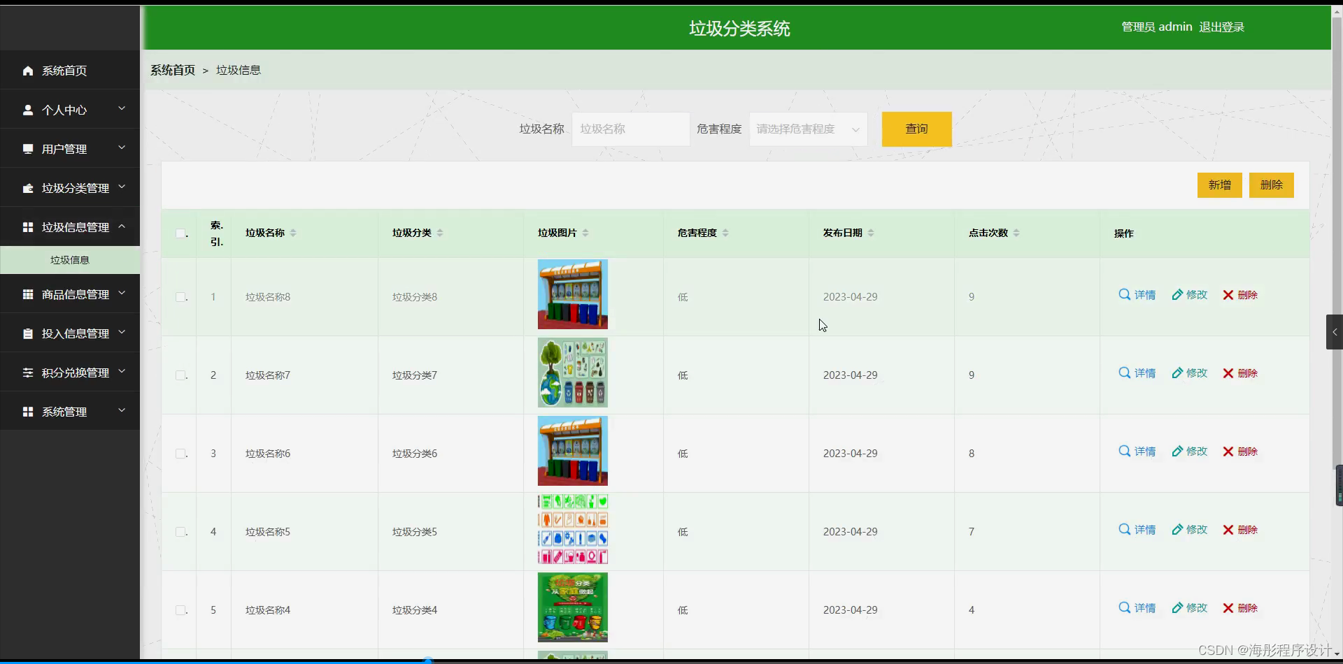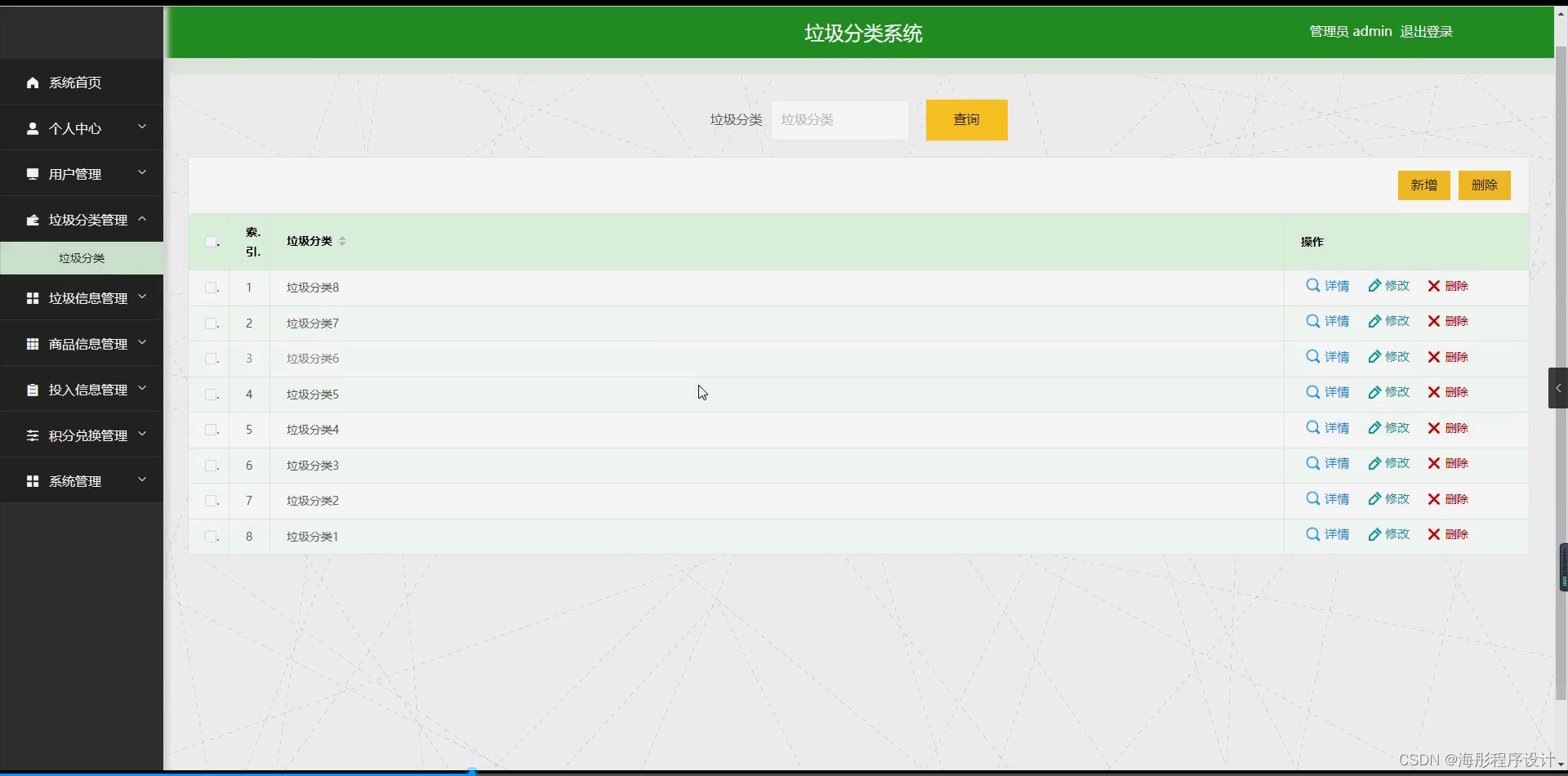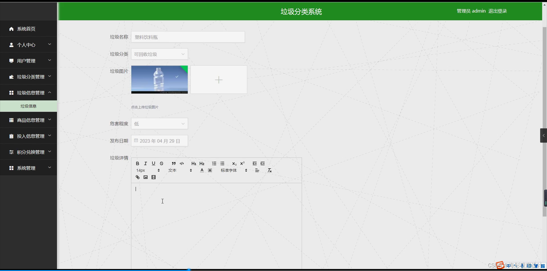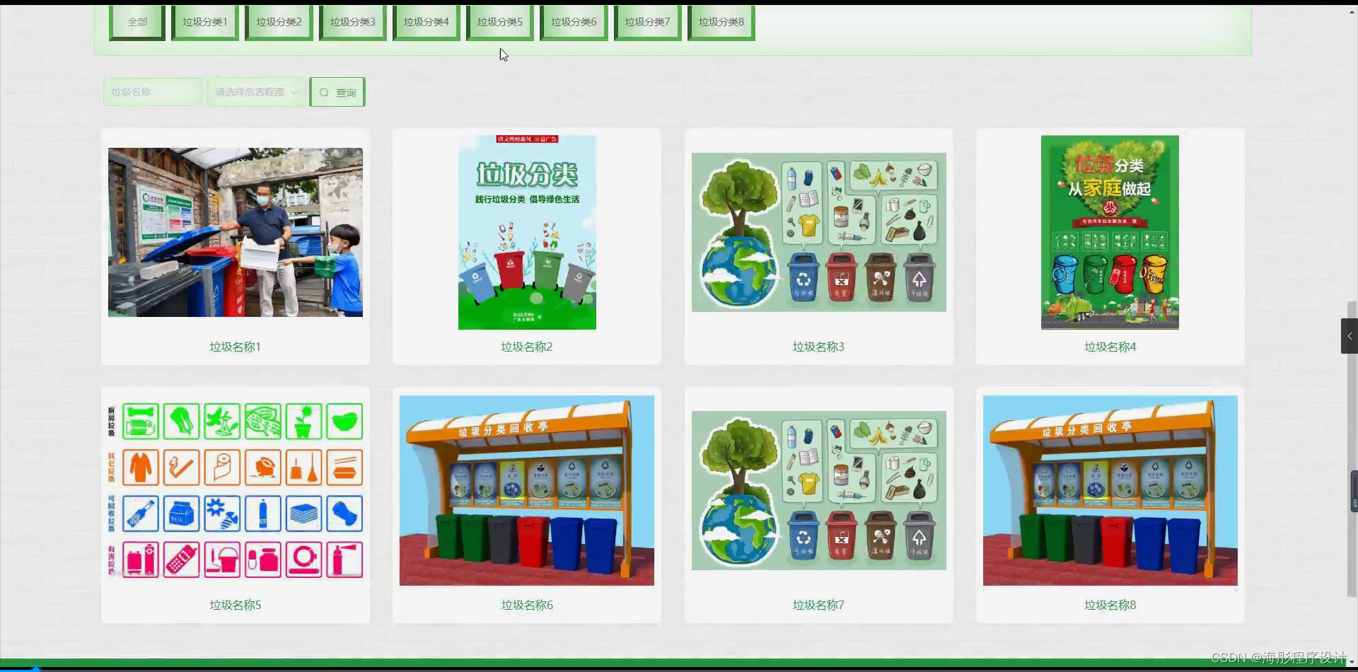 随着城市化进程的加速,垃圾问题日益严重,垃圾分类作为解决这一问题的重要手段,越来越受到社会的关注。然而,由于公众对垃圾分类知识的缺乏,以及垃圾分类设施的不完善,使得垃圾分类工作面临诸多困难。因此,开发一款能够帮助公众提高垃圾分类效率和准确性的系统,成为了当前亟待解决的问题。本毕业设计题目旨在通过前端技术(HTML+CSS+JavaScript+Vue)和后端技术(Python+Flask)以及MySQL数据库,实现一个简单易用、功能齐全的垃圾分类系统,为用户提供便捷的垃圾分类服务。
