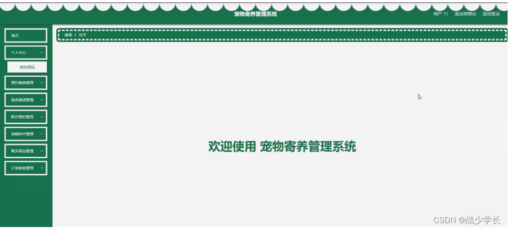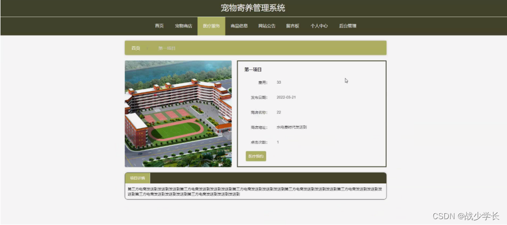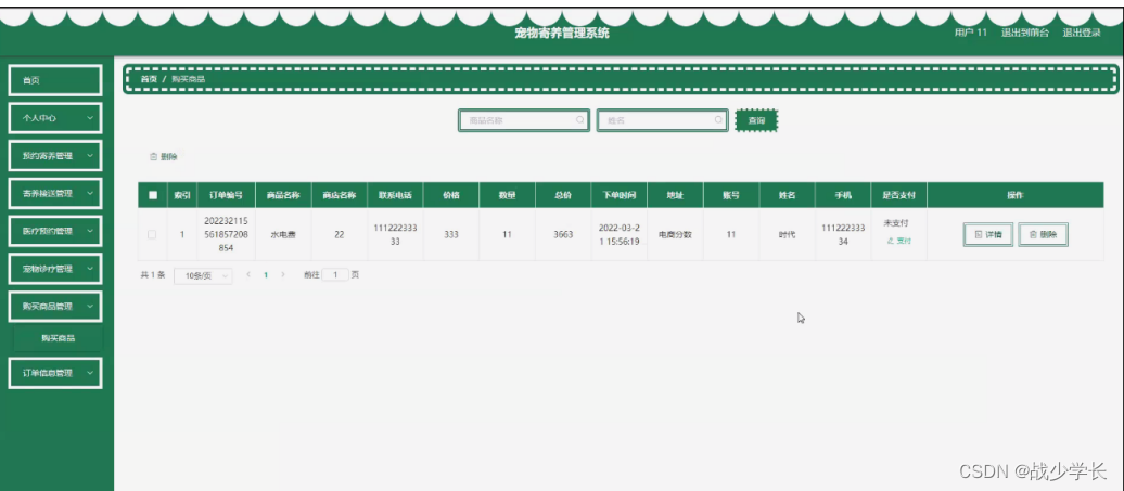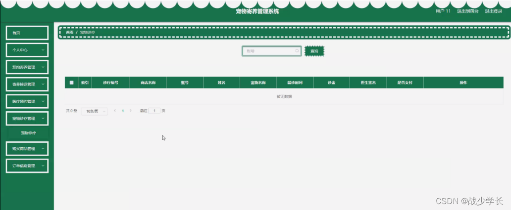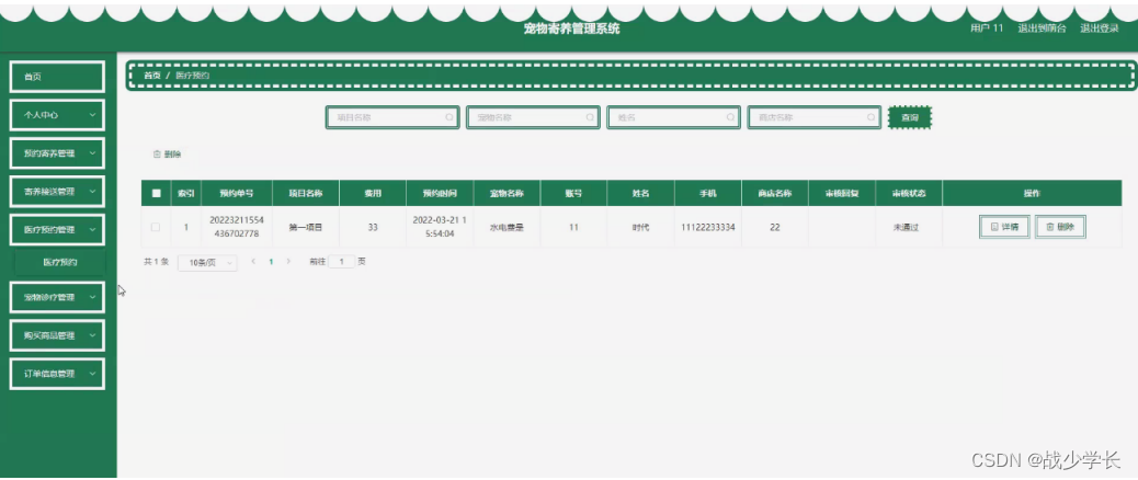 4、主页内容管理:管理员登录以后,可以对个人中心、用户管理、宠物商店管理、预约寄养管理、寄养接送管理、医疗服务管理、医疗预约管理、宠物诊疗管理、商品信息管理、商品分类管理、购买商品管理、订单信息管理 、留言板管理、系统管理进行详细操作。