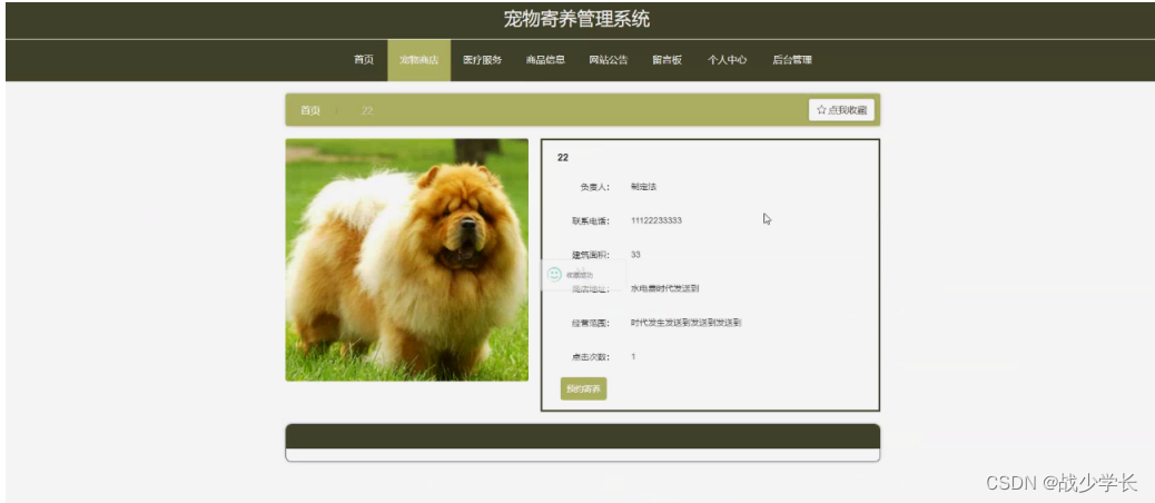 宠物商店,用户在宠物商店页面可查看名称、图片、负责人、联系电话、建筑面积、商店地址、经营范围、点击次数等内容,还可进行收藏或预约等操作,如图5-4所示。