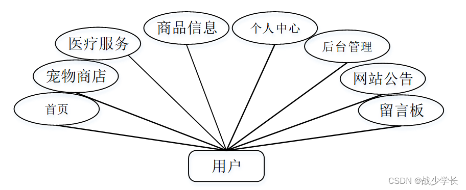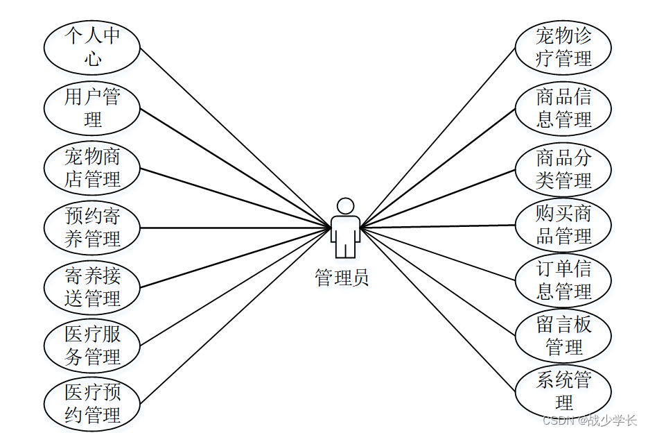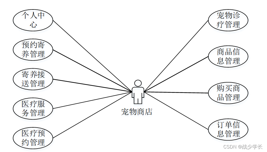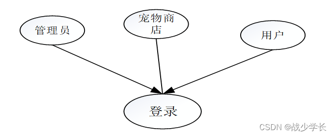 本系统有主要分为四大部分组成,有登录,宠物商店、用户和管理员等用例。