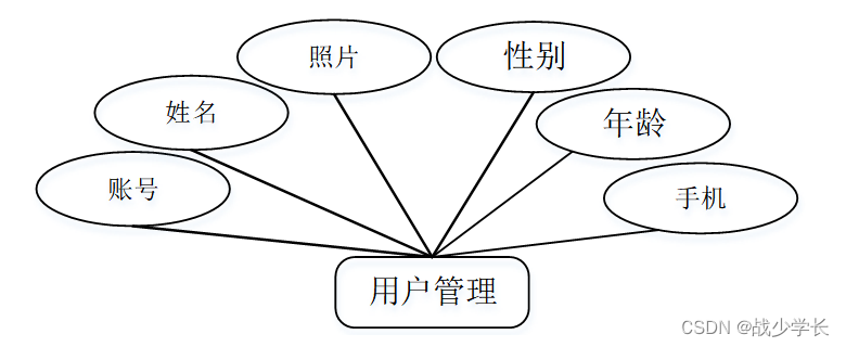 用户管理实体包括账号、姓名、照片、性别、年龄、手机等属性。用户管理实体图如图4-2所示: