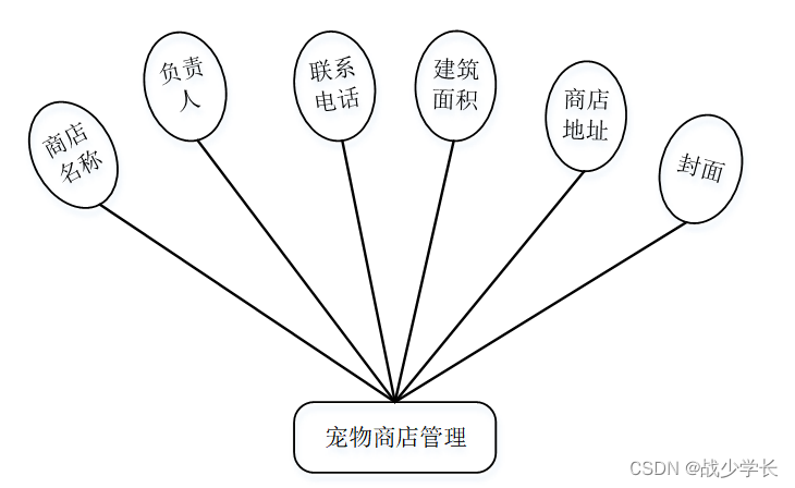 宠物商店管理实体包括商店名称、负责人、联系电话、建筑面积、商店地址、封面等属性;宠物商店管理实体图如图4-3所示: