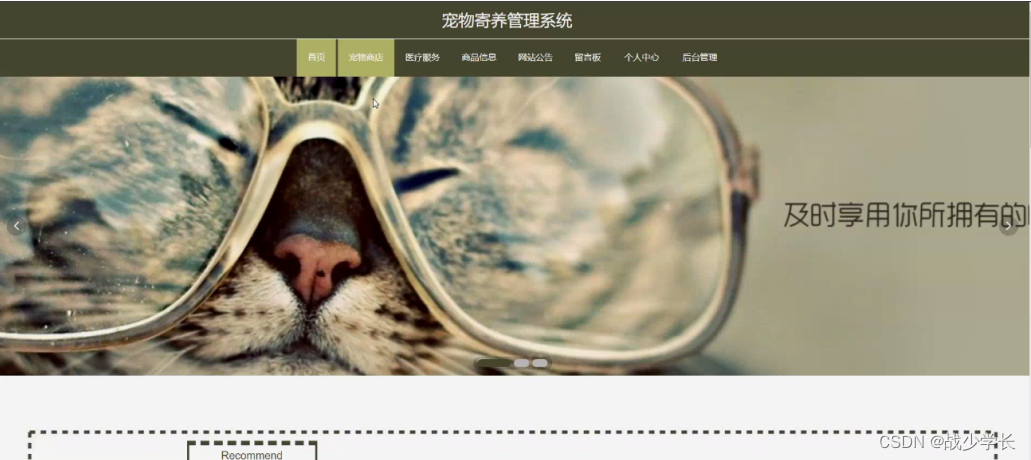 宠物寄养管理系统,在系统首页可以查看首页、宠物商店、医疗服务、商品信息、网站公告、留言板、个人中心、后台管理等内容进行详细操作,如图5-3所示。