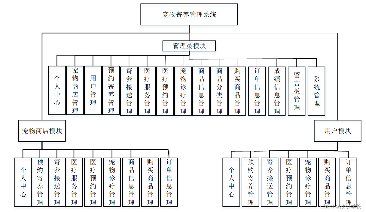 宠物寄养管理系统主要有三类用户,分别是宠物商店模块、用户模块和管理员模块,详细规划如图4-1所示。