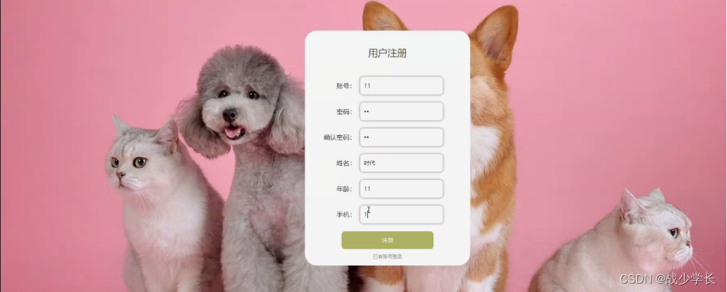 2、新用户注册:新用户填写账号、密码、姓名、年龄、手机完成注册。