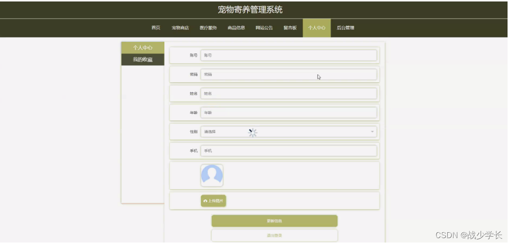 个人中心,用户可在个人中心页面通过输入账号、密码、姓名、上传图片、性别、年龄、手机等内容进行更新信息或查看我的收藏等内容,如图5-6所示。