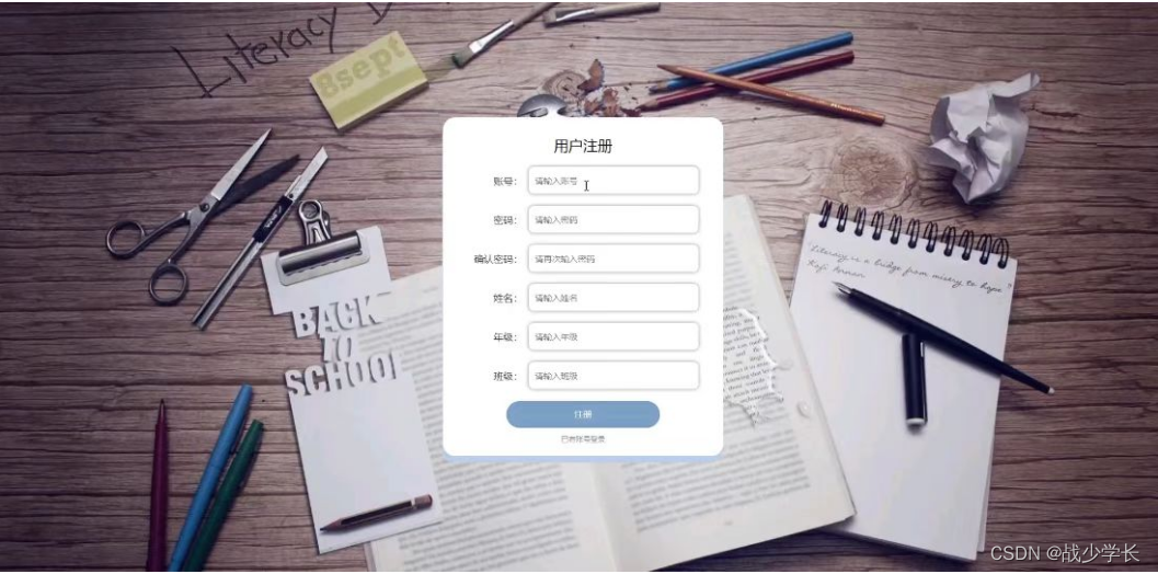 用户注册,在用户注册页面通过填写账号,密码,确认密码,姓名,年级,班级等内容完成用户注册,如图5-2所示。