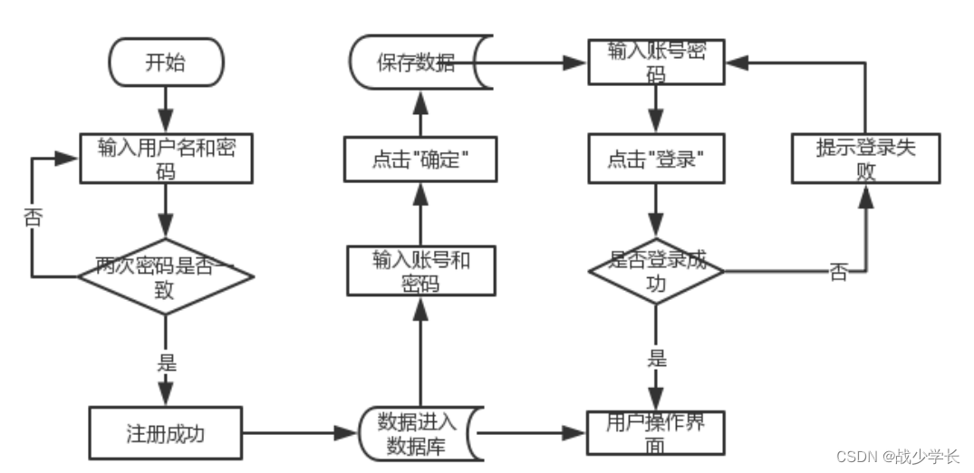 用户要通过填写自己的账号和密码进入系统,如果用户没有登录的账号需要先进行注册用户在注册页面输入账号和密码,点击注册,按要求输入注册表所要的信息,登录密码和确认密码,点击注册后,系统先判断用户输入的“密码”和“确认密码”是否一致,如果不一致,用户需重新输入;如果一致则注册成功,然后输入刚才注册的个人账号和密码点击“登录”按钮,显示“登录中请稍后”,如果登录信息正确则系统界面;如果登录信息错误则显示 “登录失败”登录注册算法流程图如图4.2登录注册流程图所示。
