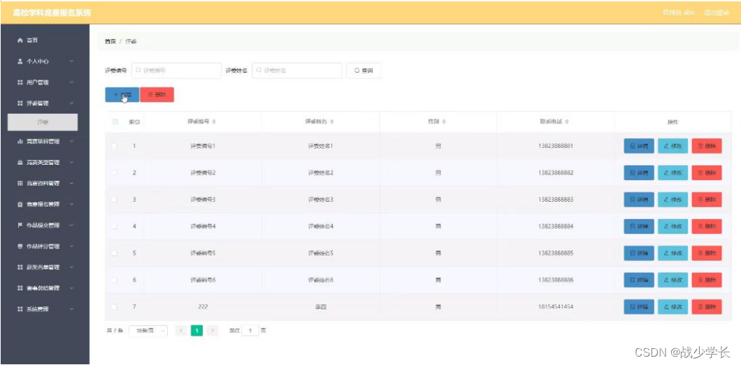评委管理,在评委管理页面可以对索引,评委编号,评委姓名,性别,联系电话等内容进行详情,修改和删除等操作,如图5-9所示。