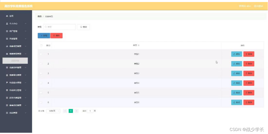 竞赛类型管理,在竞赛类型管理页面可以对索引,类型等内容进行详情和删除等操作,如图5-11所示。