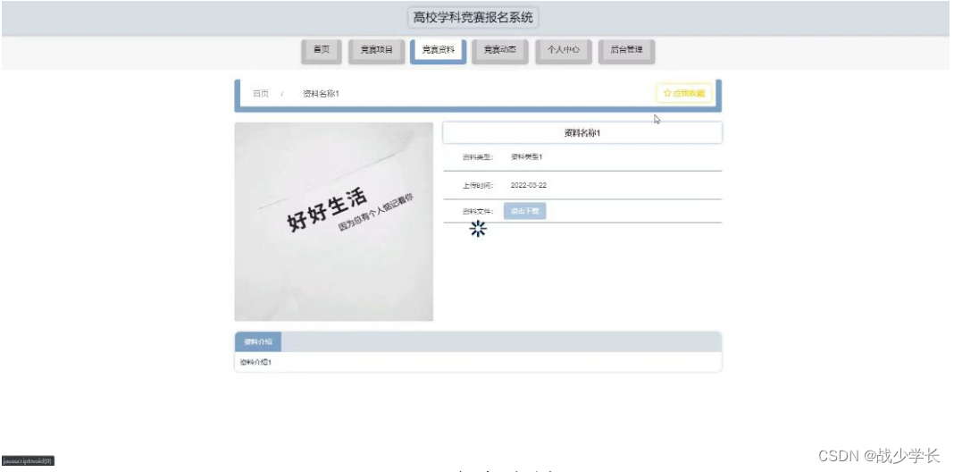竞赛资料,在竞赛资料页面可以查看资料类型,上传时间,资料文件等内容,并进行点我收藏操作;如图5-4所示。