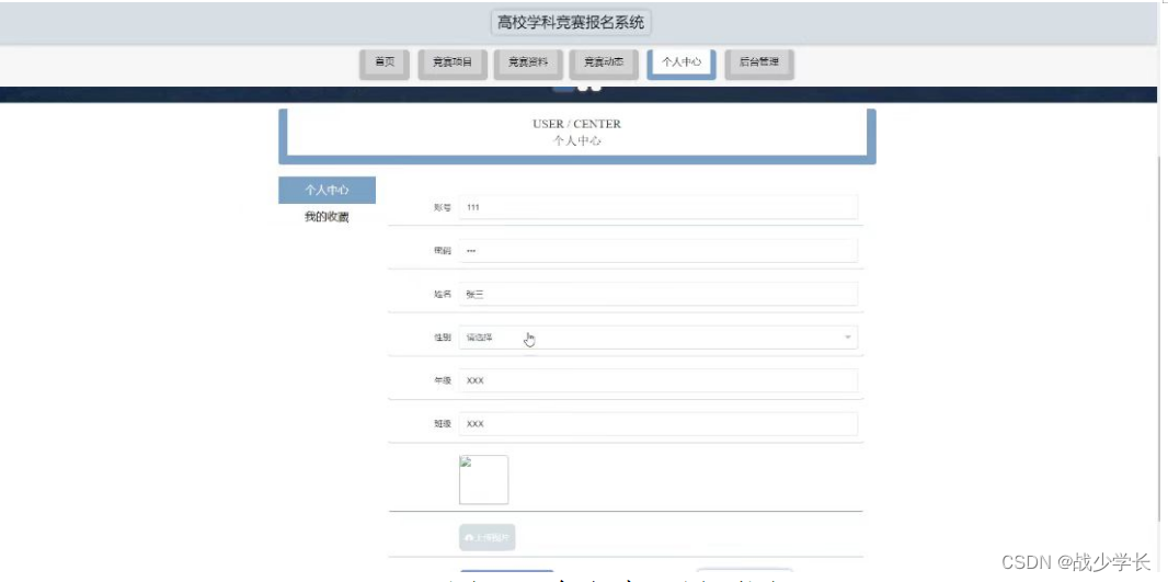 个人中心,在个人中心页面通过填写账号,密码,姓名,性别,年级,班级,上传图片等内容进行更新信息,根据需要对我的收藏进行详细操作,如图5-5所示。