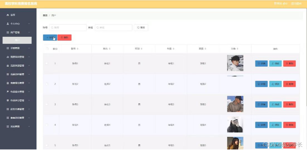 用户管理,在用户管理页面可以对索引,账号,姓名,性别,年级,班级,头像等内容进行详情,修改和删除等操作,如图5-8所示。