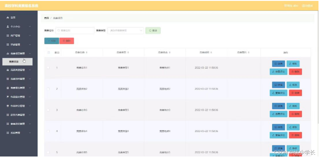 竞赛项目管理,在竞赛项目管理页面可以对索引,竞赛名称,竞赛类型,竞赛地点,竞赛时间,竞赛图片等内容进行详情,修改,查看评论和删除等操作,如图5-10所示。