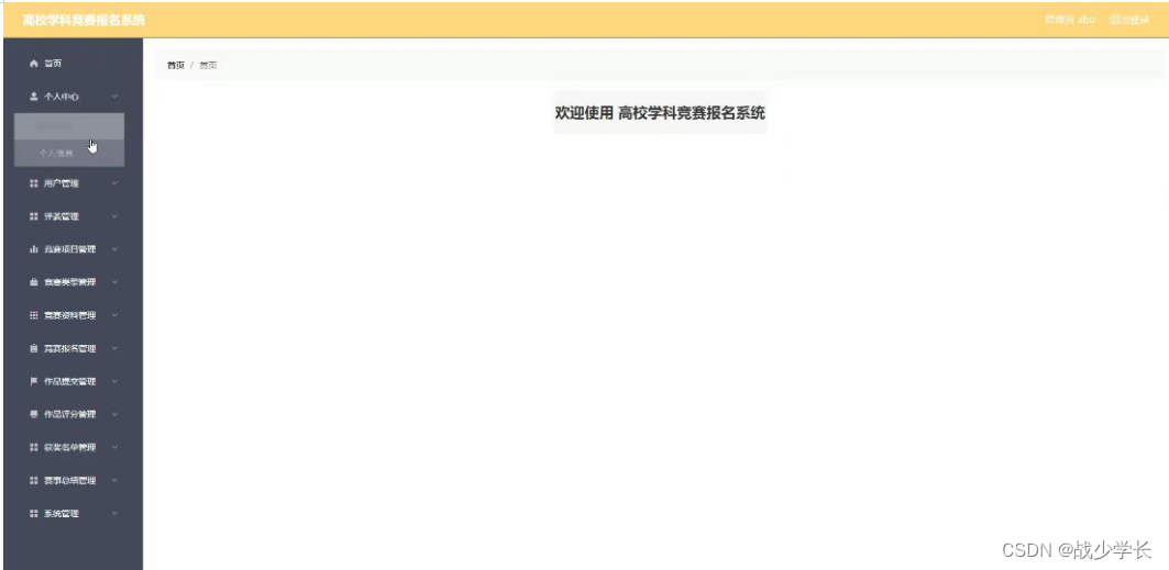 (a) 管理员;管理员进入系统主要功能包括首页,个人中心,用户管理,评委管理,竞赛项目管理,竞赛类型管理,竞赛资料管理,竞赛报名管理,作品提交管理,作品评分管理,获奖名单管理,赛事总结管理,系统管理等功能并进行操作。
