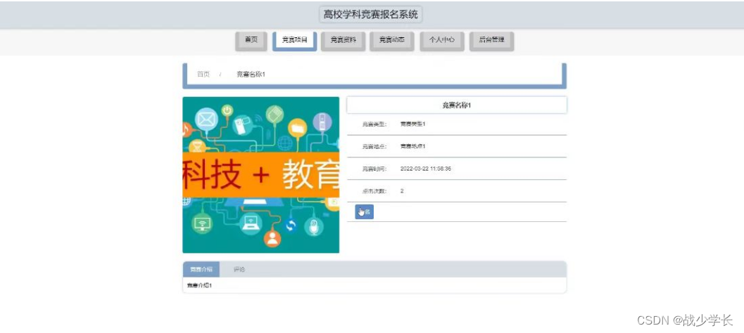 竞赛项目,在竞赛项目页面可以查看竞赛类型,竞赛地点,竞赛时间,点击次数等内容,并进行报名和评论操作,如图5-3所示。