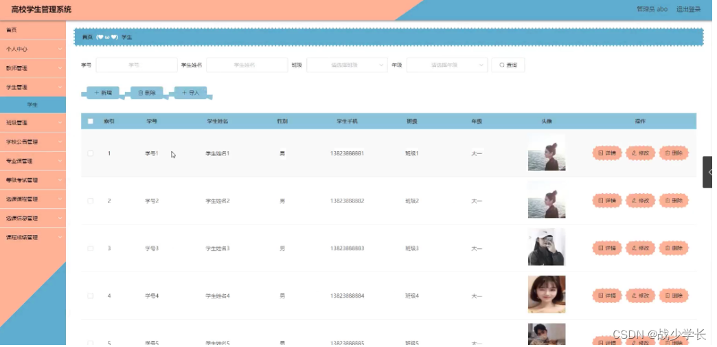学生管理,在学生管理页面可以对索引,学号,学生姓名,性别,学生手机,班级,年级,头像等信息进行详情,修改和删除等操作,如图5-4所示。