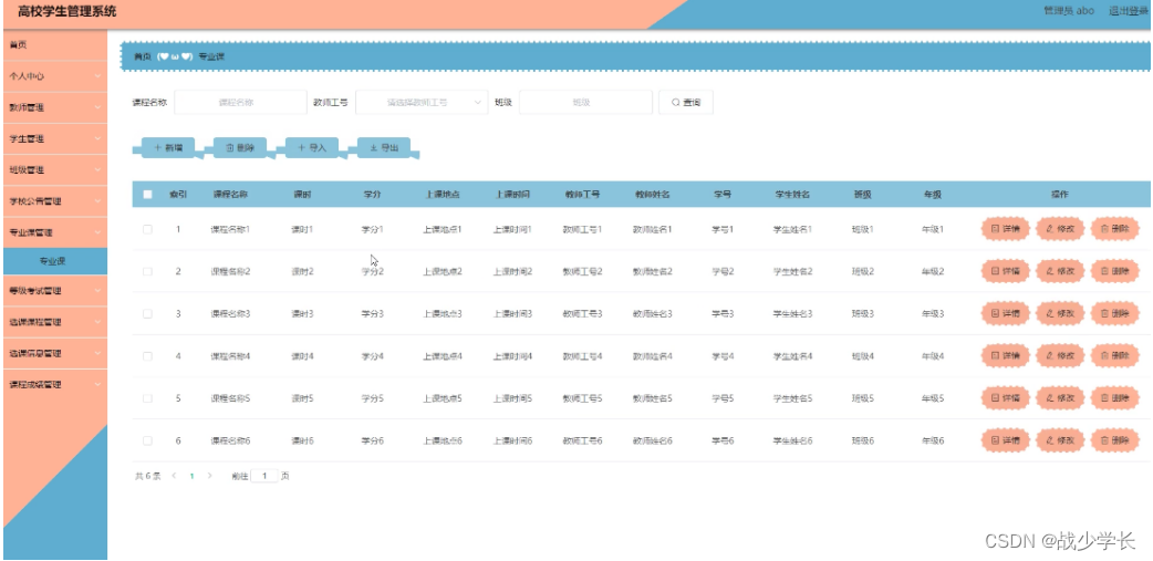 专业课管理,在专业课管理页面可以对索引,课程名称,课时,学分,上课地点,上课时间,教师工号,教师姓名,学号,学生姓名,班级,年级等内容进行详情,派单和删除等操作,如图5-6所示。
