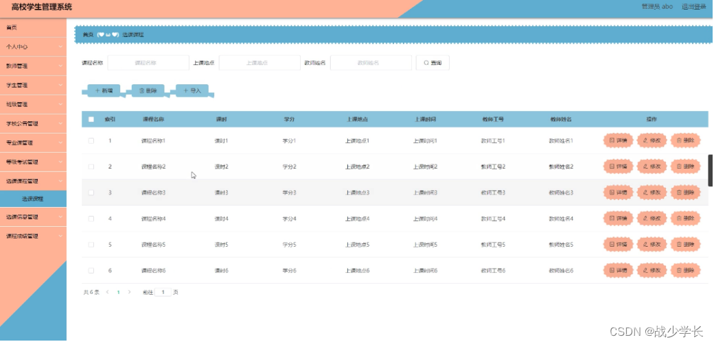 选课课程管理,在选课课程管理页面可以对索引,课程名称,课时,学分,上课地点,上课时间,教师工号,教师姓名等内容进行详情,修改,删除等操作,如图5-8所示。