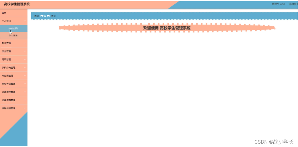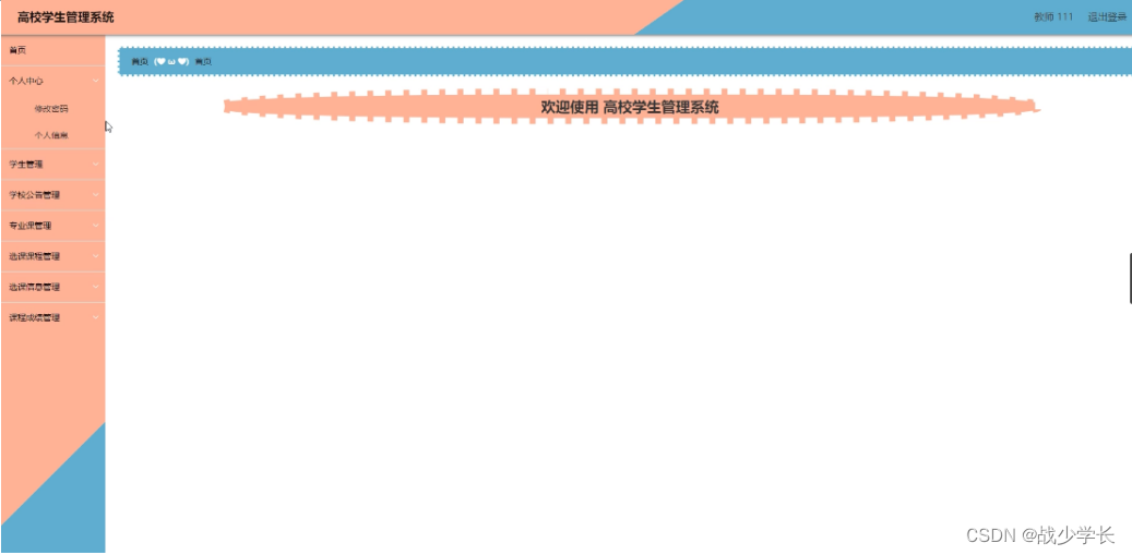 教师登录进入高校学生管理系统可以对首页,个人中心,学生管理,学校公告管理,专业课管理,选课课程管理,选课信息管理,课程成绩管理等功能进行相应操作,如图5-11所示。