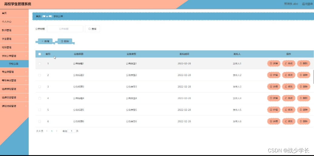 学习公告管理,在学习公告管理页面可以对索引,公告标题,公告类型,发布时间,发布人等内容进行详情,修改,查看评论和删除等操作,如图5-5所示。