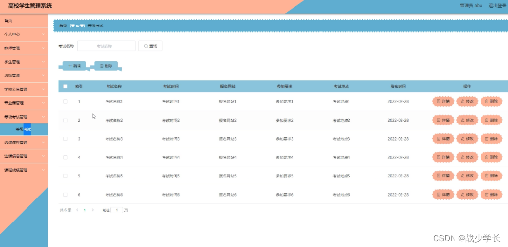 等级考试管理,在等级考试管理页面可以对索引,考试名称,考试时间,报名网站,参加要求,考试地点,发布时间等内容进行详情和删除操作,如图5-7所示。