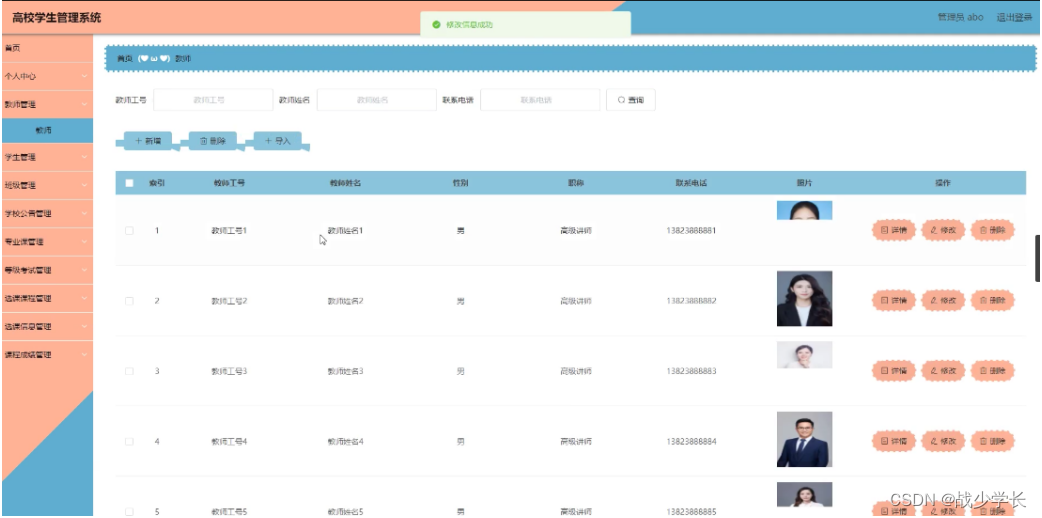 教师管理,在教师管理页面可以对索引,教师工号,教师姓名,性别,职称,联系电话,照片等内容进行详情,修改和删除等操作,如图5-3所示。