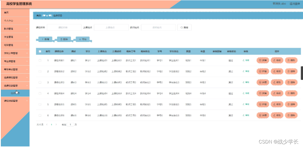 选课信息管理,在选课信息管理页面可以对索引,课程名称,课时,学分,上课地点,教师工号,教师姓名,学号,学生姓名,班级,年级,审核回复,审核状态,审核等内容进行详情和删除等操作,如图5-9所示。