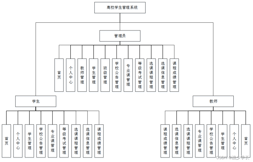管理员登录系统后,可以对首页,个人中心,教师管理,学生管理,班级管理,学校公告管理,专业课管理,等级考试管理,选课课程管理,选课信息管理,课程成绩管理等功能进行相应的操作管理,如图5-2所示。
